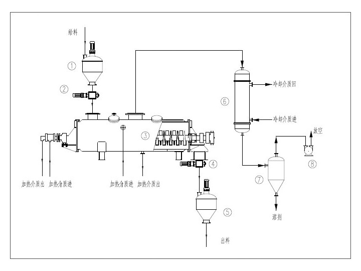 干燥機以蒸汽,熱水或?qū)嵊妥鳛榧訜峤橘|(zhì),軸端裝有熱介質(zhì)導入導出的旋轉(zhuǎn)接頭。加熱介質(zhì)分為兩路,分別進入干燥機殼體夾套和槳葉軸內(nèi)腔,將器身和槳葉軸同時加熱,以傳導加熱的方式對物料進行加熱干燥。被干燥的物料由螺旋送料機定量地連續(xù)送入干燥機的加料口,物料進入器身后,通過槳葉的轉(zhuǎn)動使物料翻轉(zhuǎn)、攪拌,不斷更新加熱介面,與器身和槳葉接觸,被充分加熱,使物料所含的表面水分蒸發(fā)。同時,物料隨槳葉軸的旋轉(zhuǎn)成螺旋軌跡向出料口方向輸送,在輸送中繼續(xù)攪拌,使污泥中滲出的水分繼續(xù)蒸發(fā)。^后,干燥均勻的合格產(chǎn)品由出料口排出。