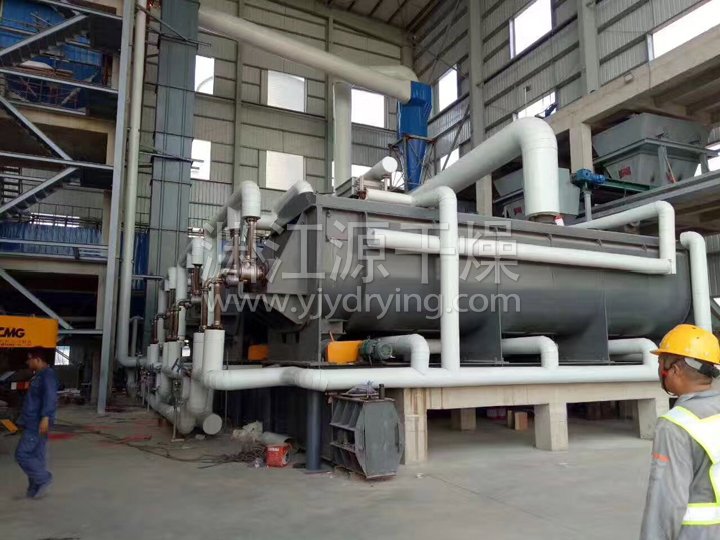 在漿葉及夾套通入蒸汽加熱的同時(shí),出料口上部同時(shí)通入經(jīng)過加熱后的干空氣進(jìn)一步干燥,這樣大大增加了設(shè)備的干燥強(qiáng)度。蒸發(fā)出來的水分由尾氣帶出干燥機(jī),經(jīng)過布袋除塵器過濾,將干燥后的細(xì)粉回收下來,濕空氣由水除塵后引風(fēng)機(jī)排出室外。